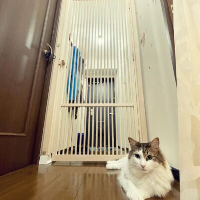 猫が外へ飛び出しやすい玄関まわりに、にゃんガードを設置。 出入りの動線を妨げず、人...