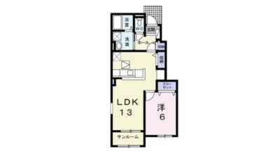 LDK13帖+洋室6帖のゆとりある間取りで、日当たりの良い住空間です。2016年築の落ち着いたアパートタイプ。追い焚き機能付き浴室、温水洗浄便座、エアコン2台、対面式キッチンなど、日常生活に必要な設備はしっかり整っています。サンルーム付きで、天候に左右されず室内干しが可能。静かな住環境を求める方におすすめの一室です。
